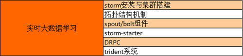 3、學習效果:熟悉storm架構原理;能夠獨立完成storm環境的搭建;熟悉storm編程模型,并能構建出相關功能的實例;熟練使用trident構建storm任務。