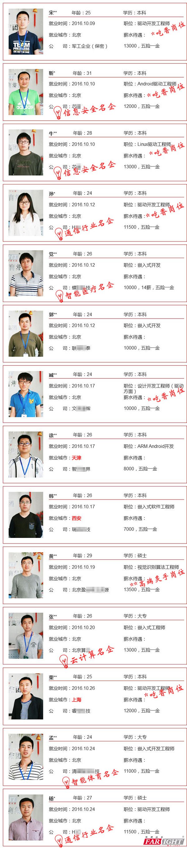 那么他們的就業情況如何呢?這些嵌入式精英人才是否已經走上了自己滿意的工作崗位呢?今天起,華妹就為大家持續發布星創客畢業學員的就業戰報,看著他們的入職公司和薪水,你會不會心動呢?戰報匯總: