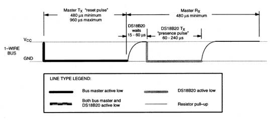 通過(guò)復(fù)位信號(hào),可以檢測(cè)DS18B20是否工作正常,并通知DS18B20準(zhǔn)備通信。