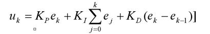U(k) = P *e(k) + I *[e(k)+e(k-1)+...+e(0)]+ D *[e(k)-e(k-1)]。