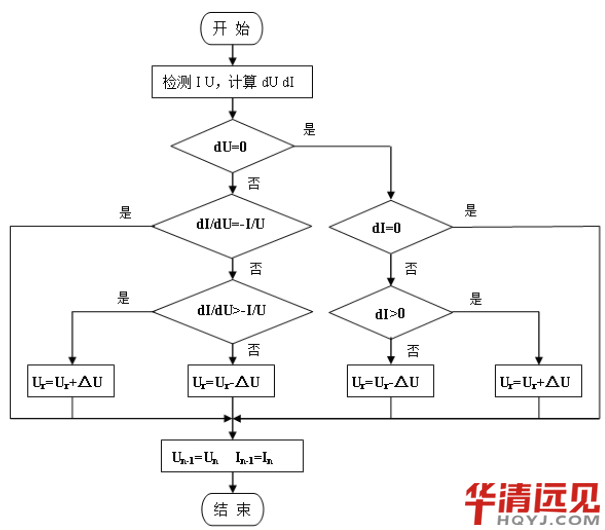綜合考慮,MPPT的算法采用極限追蹤控制法來進行軟件實現,即采集PN側電壓、流向PN側的電流數據,計算 、 和 ,判斷 與 的關系, 大于 ,此時應按 減小PN側的目標電壓;若 小于 ,此時應按 增加PN側的目標電壓。