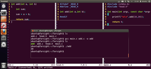在add.c中定義了add()函數(shù),在head.h中聲明了add()函數(shù),main.c中,#include<stdio.h>引用標(biāo)準(zhǔn)輸入輸出頭文件,#include”head.h”引用我們自己寫的head.h頭文件,main()函數(shù)是程序的入口,printf()函數(shù)是標(biāo)準(zhǔn)輸出函數(shù),它的作用是向終端輸出若干個(gè)任意類型的數(shù)據(jù),add()函數(shù)在add.c中定義了,在main.c中的main()函數(shù)中進(jìn)行了調(diào)用。