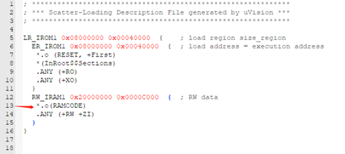 2.在xx.sct文件中,定義一個RAMCODE的section,放在RW_IRAM1執(zhí)行區(qū)域(0x20000000-0x00002000)。