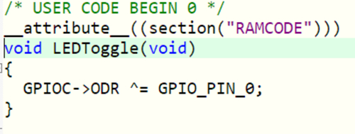 方法二:在需要放到RAM中的函數(shù)前,用__attribute__((section("RAMCODE")))聲明該函數(shù)放在RAMCODE section中。