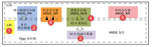 獨立看門狗的計數器是一個 12 位的遞減計數器,最大值為 0XFFF,當計數器減到 0時,會產生一個復位信號:IWDG_RESET,讓程序重新啟動運行,如果在計數器減到 0 之前刷新了計數器的值的話,就不會產生復位信號,重新刷新計數器值的這個動作我們俗稱喂狗。