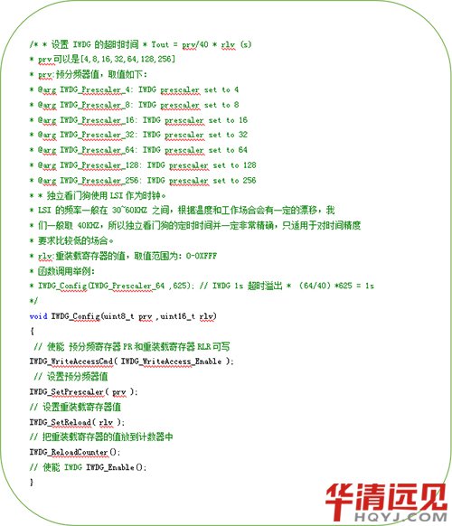 獨立看門狗的時鐘由獨立的 RC振蕩器 LSI提供,即使主時鐘發生故障它仍然有效,非常獨立。LSI的頻率一般在 30~60KHZ之間,根據溫度和工作場合會有一定的漂移,我們一般取 40KHZ,所以獨立看門狗的定時時間并一定非常精確,只適用于對時間精度要求比較低的場合。