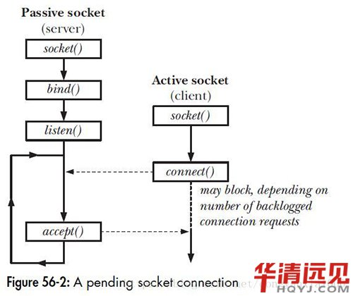 The client may call connect() before the server calls accept(). This could happen, for example, because the server is busy handling some other clients. This results in a pending connection, as illustrated in Figure 56-2.
