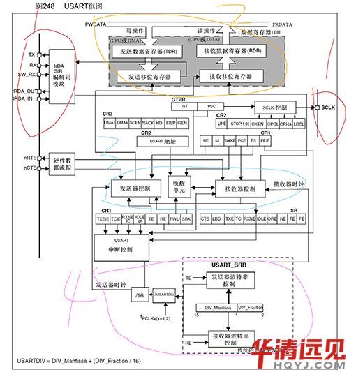 USART有專門控制發(fā)送的發(fā)送器、控制接收的接收器,還有喚醒單元、中斷控制等。