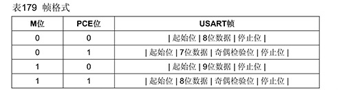 根據(jù)M位定義的幀長(zhǎng)度,可能的USART幀格式列在下表中。
