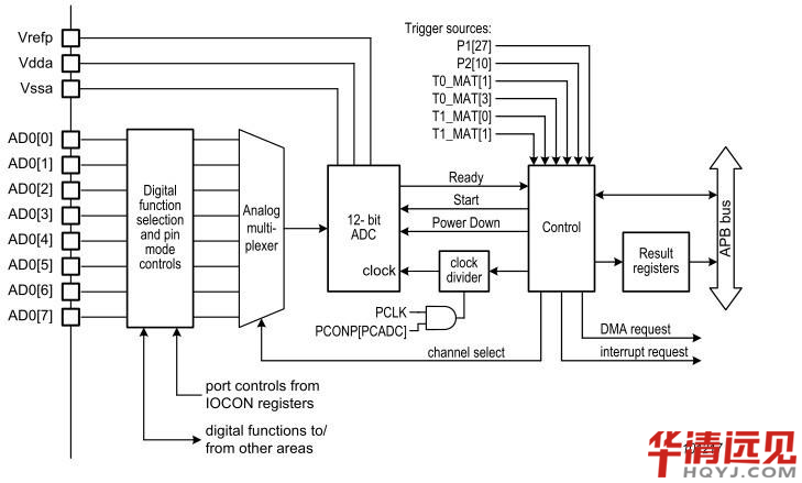 (1)10 位或 12 位 CMOS 模數(shù)轉(zhuǎn)換器(ADC)由4通道模擬輸入組成。它利用 5MHz A/D 轉(zhuǎn)換器時鐘以最大 1MSPS 的轉(zhuǎn)換速率將模擬輸入信號轉(zhuǎn)換為 10 位或 12 位二進(jìn)制數(shù)字代碼。A/D 轉(zhuǎn)換器采用片上 sample-and-hold 功能。ADC 支持低功耗模式.