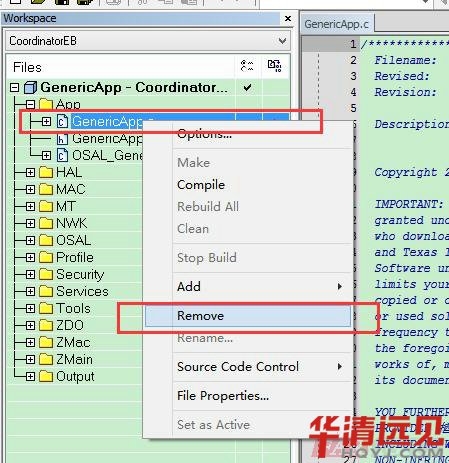 刪除工程中的GenericApp.C 文件,刪除方法是:先選擇要刪除的文件,右鍵在彈出的下拉菜單中選擇Remove 即可,如下