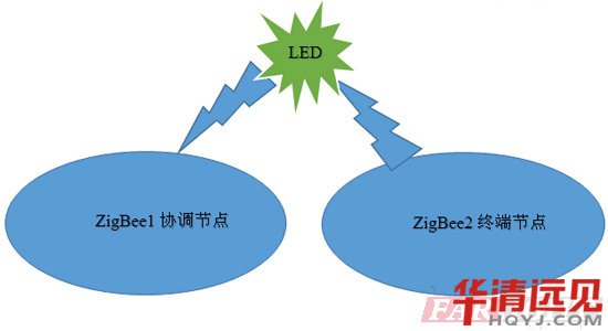 數據傳輸實驗的基本功能:兩個ZigBee節點進行點對點通信,ZigBee終端節點2發送"LED"三個字符,ZigBee協調節點收到數據后,對接收到的數據進行判斷,如果收到的數據是"LED",則使開發板上的LED燈閃爍(1S閃爍一次)。數據傳輸實驗原理圖如圖下所示。無線控制終端節點燈,一秒鐘閃亮一次。