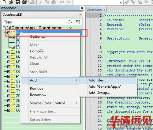 在工程工程中添加兩個文件Coordinator.c和EndDevice.c。添加如下:先在C:\Texas Instruments\ZStack-CC2530-2.3.0-1.4.0\Projects\zstack\Samples\GenericApp\Source文件夾中新建上面兩個.c文件。然后添加你剛才新建的文件(EndDevice.c和Coordinator.c)。