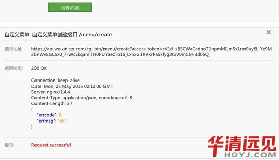 菜單創(chuàng)建成功。微信還提供了其他菜單操作,在開發(fā)者文檔中有詳細的說明,參考即可。