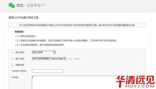 按照需求根據(jù)示例做好菜單后,在文檔下面可以發(fā)現(xiàn):使用網(wǎng)頁調(diào)試工具調(diào)試該接口。