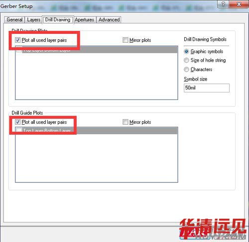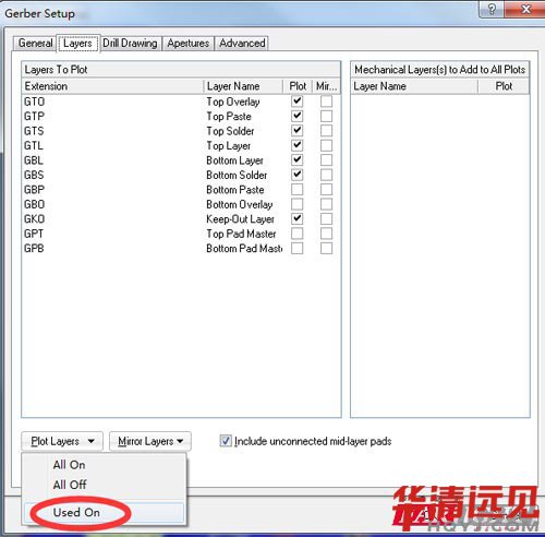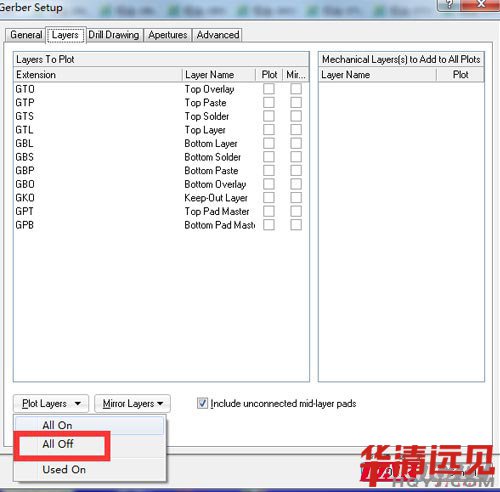 接著重復操作【File】→【Fabrication Outputs】→【Gerber Files】, 這一次選擇【Drill Drawing】,然后勾上下面兩個選項。打開【Layers】菜單選擇【 All Off】,然后點擊 【OK】,同樣彈出窗口直接關閉即可,無需保存。