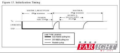DS18B20的所有通信都由由復位脈沖組成的初始化序列開始。該初始化序列由主機發出,后跟由DS18B20發出的存在脈沖(presence pulse)。下圖(插圖13,即如下截圖)闡述了這一點。當發出應答復位脈沖的存在脈沖后,DS18B20通知主機它在總線上并且準備好操作了。