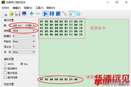 根據(jù)ModBus協(xié)議:01:設(shè)備地址 03:設(shè)備地址 00 00:起始寄存器地址 00 02:從起始地址,讀取2個(gè)地址,讀取數(shù)據(jù)值。C4 0B: CRC校驗(yàn)