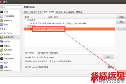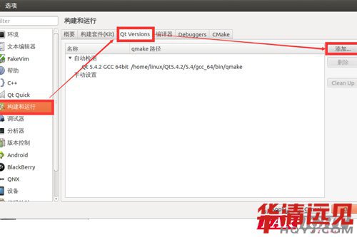 點擊選項界面左側“構建和運行”后選擇”Qt Versions”選項卡后點擊右側”添加”按鈕