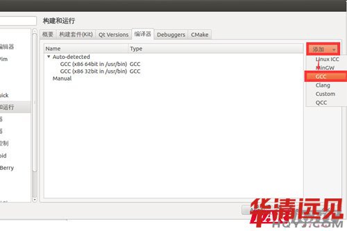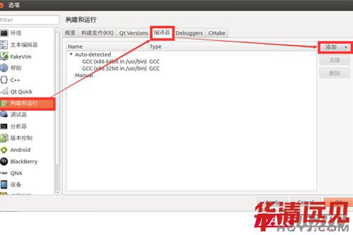 點擊選項界面左側“構建和運行”后選擇”編譯器”選項卡后點擊右側”添加”按鈕
