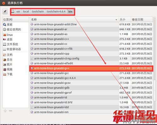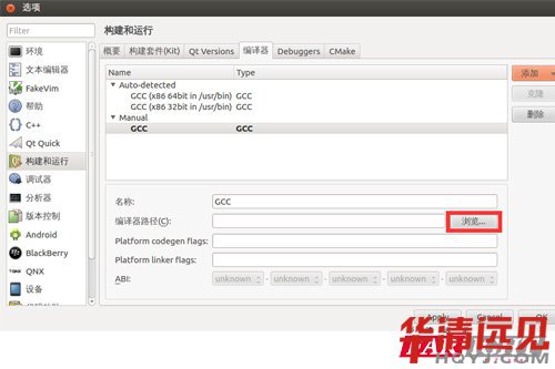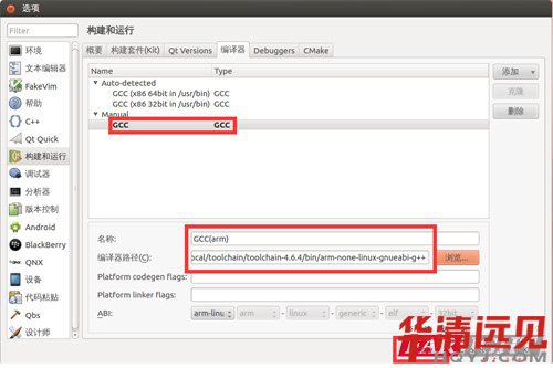 選擇GCC路徑,這里選擇交叉工具鏈路徑中g++路徑,華清遠見提供開發環境g++路徑為/usr/local/toolchain/toolchain-4.6.4/bin/arm-none-linux-gnueabi-g++,選擇后點擊”OK”