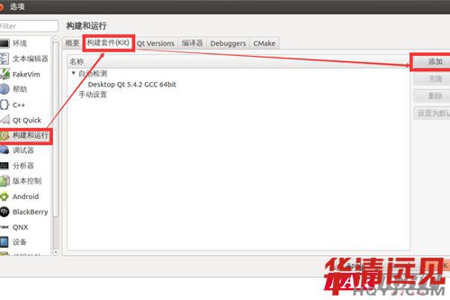 點擊選項界面左側“構建和運行”后選擇”構建套件(Kit)”選項卡后點擊右側”添加”按鈕