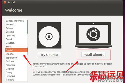3. 選擇English-》Install Ubuntu (不建議選擇中文,這樣避免在開發過程中,碰見的中文問題,如果需要中文輸入等,可以進入系統之后在進行配置)