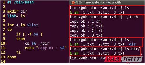 f) 第10行:判斷如果是普通文件則拷貝該文件到目錄dir下(-f 判斷普通文件)