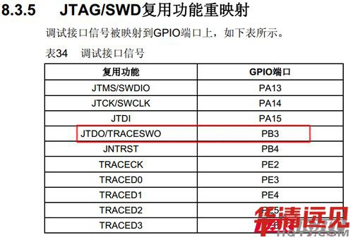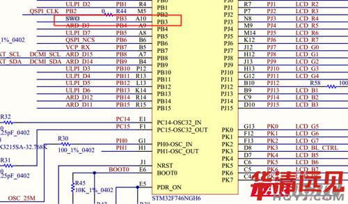 通過從上圖三個手冊中了解,ITM是一種虛擬的串口,可以向串口一樣進行將數據打印到指定輸出設備上,但是必須滿足一個條件,那就是它依賴于SWO引腳,通常我們使用J-Link或者ST-Link簡易模塊進行多STM32程序的燒錄,通常只需要兩個端口,SW_CLK和SW_DIO,這種情況是不能使用ITM的,因為SWO引腳并沒有接!那么這個神秘的SWO引腳到底是什么引腳呢?呵呵!快的方法是在原理圖當中找,如下圖: