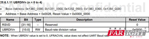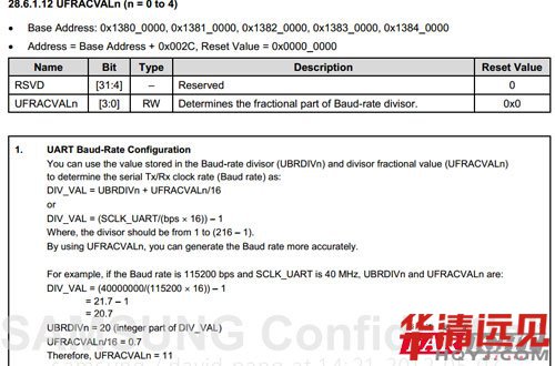 上式計算出來的 UBRDIVn 寄存器值不一定是整數, UBRDIVn 寄存器取其整數部分,小部分由 UFRACVALn 寄存器設置, UFRACVALn 寄存器的引入,使產生波特率更加精確。