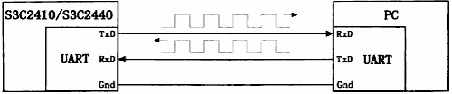 發送數據時,CPU將并行數據寫入UART,UART按照一定的格式在一根電線上串行發出;接收數據時,UART檢測另一根電線上的信號,串行收集然后放在緩沖區中,CPU即可讀取UART獲得這些數據。UART之間以全雙工方式傳輸數據,精確的連線方法只有3根電線:TxD用于發送數據,RxD用于接收數據,Gnd用于給雙發提供參考電平,連線如下: