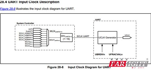 Exynos4412 UART的時鐘源有八種選擇: XXTI 、XusbXTI 、SCLK_HDMI24M 、SCLK_USBPHY0 、 SCLK_HDMIPHY 、SCLKMPLL_USER_T 、SCLKEPLL 、SCLKVPLL ,由 CLK_SRC_PERIL0 寄存器控制。