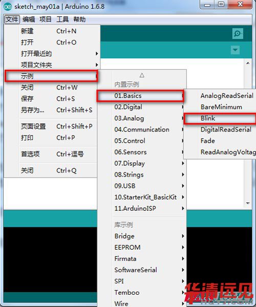 在文件菜單中,選擇示例--->01.Basics--->Blink,如下圖所示,可以打開示例程序Blink。