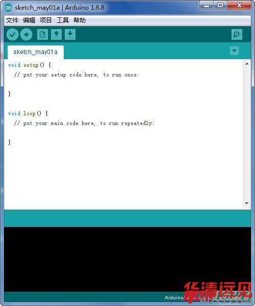 從剛才的IDE界面我們就能看出來,新建一個文件后IDE自動在里面添加了兩個函數,一個叫setup(),一個叫loop()。這兩個函數就是Arduino程序的基本框架。Setup用來做初始化,只運行一次。loop是一個循環,控制程序的效果,loop里面的程序會重復執行。