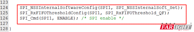 4.啟動NSS為軟件管理模式,配置FIFO的接收閥值為事件生成的1/4,后就使能SPI1控制器了。
