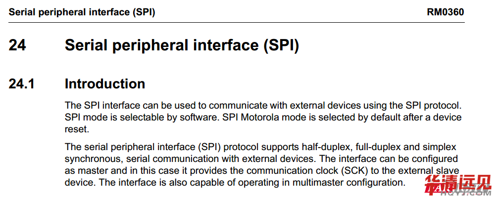 當然,這其實只是SPI通信硬件接口的一部分,而且是基礎的部分。那么現在就STM32F030的硬件SPI資源進行講解。打開參考手冊《STM32F030x468C and STM32F070x6B advanced ARM®-based 32-bit MCUs.pdf》