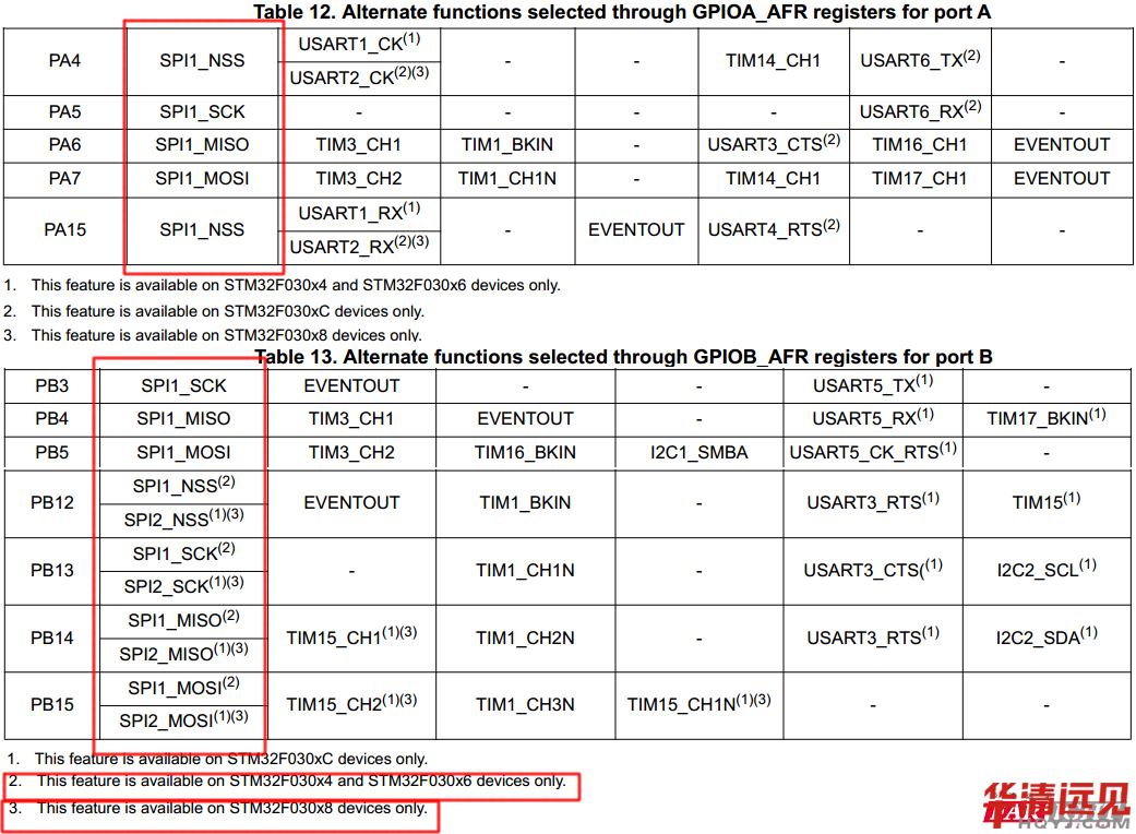 問題就來了!你咋知道我們所用的資源對應的到時是哪一個GPIO_AF_x?比日說SPI1從函數說明來說可能是GPIO_AF_0也可能是GPIO_AF_1,這個咋玩呢??還是一句話,在參考手冊或者數據手冊Datasheet上找,肯定能找到。沒錯,就是在Datasheet上找到了!如下圖: