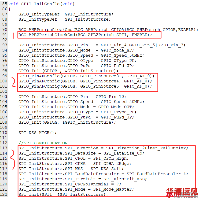 1.打開SPI1的時鐘嘍!不理解為毛是APB2的話,沒關系,兩種方法(1)看時鐘樹(2)查看stm32f10x_rcc.c文件!找到RCC_APB2Periph_SPI1即可!嘿嘿!