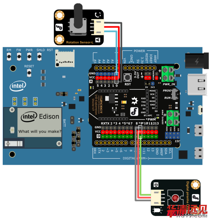 按照如圖所示,將led燈安裝到13號接插口,將角度傳感器接到A0口