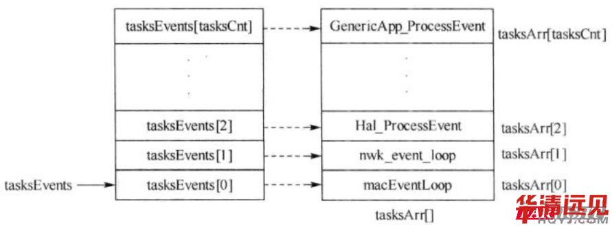 該數(shù)組的聲明為:const pTaskEventHandlerFn tasksArr[],其中pTaskEventHandlerFn的定義為:typedef unsigned short (*pTaskEventHandlerFn)( unsigned char task_id, unsigned short event ),這是定義了一個(gè)函數(shù)指針。tasksArr數(shù)組的每一項(xiàng)都是一個(gè)函數(shù)指針,指向了事件處理函數(shù)。