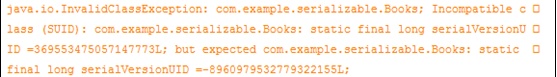 大家會發現在Books類中聲明了一個serialVersionUID,這個常量并不是必須的,不聲明也可實現對象的序列化,但是在一些情況下會對反序列化產生影響。如果我們不去自己指定一個serialVersionUID,在序列化時會按照類的結構自動生成一個serialVersionUID值,但是在序列化存儲后改變了類的結構,如增加和刪除成員變量,重新編譯運行后直接進行反序列化的話,這個時候會出現反序列化失敗。