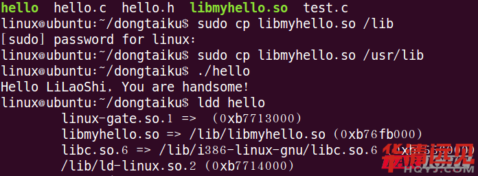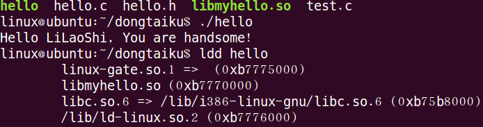 此時就生成了文件名為libmyhello.so(庫名為myhello)的動態(tài)庫。下一步就可以將該動態(tài)庫鏈接到程序中了。