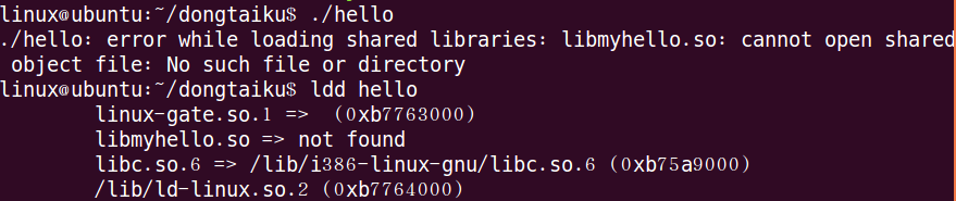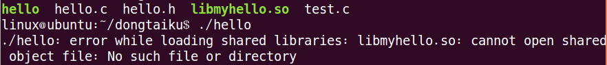 錯誤信息為“當(dāng)加載共享庫的時候,無法找到libmyhello.so的位置:沒有該文件或目錄”。