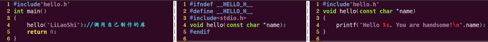 第一步:準(zhǔn)備3個文件:hello.h、hello.c、test.c。其中hello.h和hello.c用于制作靜態(tài)庫,test.c是測試程序主函數(shù)。