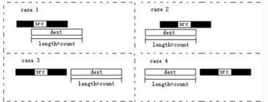 從圖中可以看出,src的內存區域和dest的內存區域相對位置和重疊關系有四種情況,memcpy沒有考慮重疊的情況,而memmove考慮到了全部情況,因此memcpy函數的時候可能出現意向不到的結果。