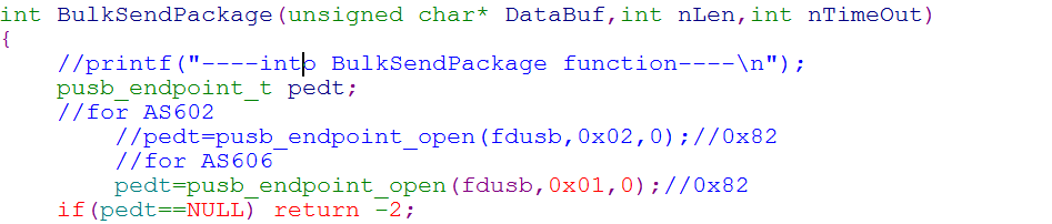 在文件系統支持上卡了很長時間,底層文件系統支持加不上就會導致Open usb fail,設備就無法打開,但是AS606模塊給我們提供了三種打開方式,分別是USB,UDISK和COM,我們試用的內核雖然不支持usbfs文件系統導致usb設備無法打開,但是可以支持UDISK設備的,所以我們依舊可以使用USB接口去打開指紋模塊,將原廠提供的demo交叉編譯后拷貝到開發板直接運行就可打開UDISK設備,但是調試程序無法執行,需要修改SYDevice.cpp文件里BulkSendPackage函數中的一個參數,如下圖: