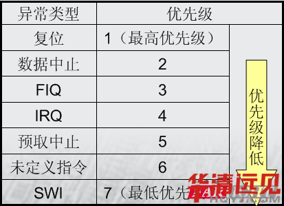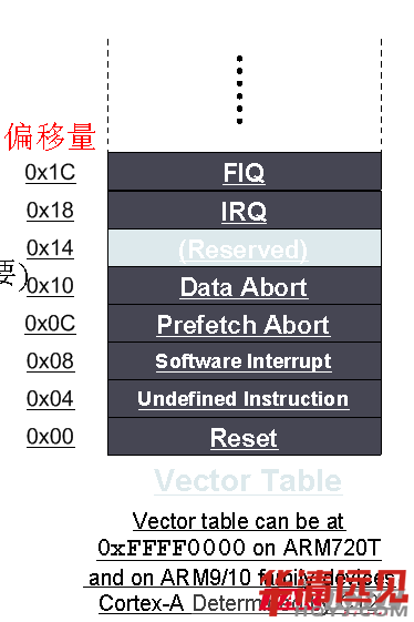 從上圖可以知道,不同的異常產(chǎn)生時,ARM核修改的PC值不一樣。例如:如果是swi指令引起的異常,ARM核后就會修改pc的值為0x08。