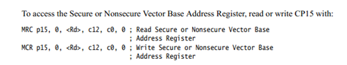 例如:在cortex-A8上,我們可以操作如下協(xié)處理指令,來告訴ARM核異常向量表的位置。