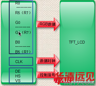 驅動板TTL輸出接口中一般包含RGB數據信號、時鐘信號和控制信號這三大類信號。如下圖所示:
