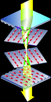 c、光與液晶分子產(chǎn)生偏轉(zhuǎn)效果:可以看到射入上表面的一束光線排列方式與槽的方向相同,但是經(jīng)過(guò)中間液晶分子的旋轉(zhuǎn)使得這束光線的方向發(fā)生了偏轉(zhuǎn),終從下表面射出時(shí),這束光線的排列方向又變成了與下表面槽方向平行。